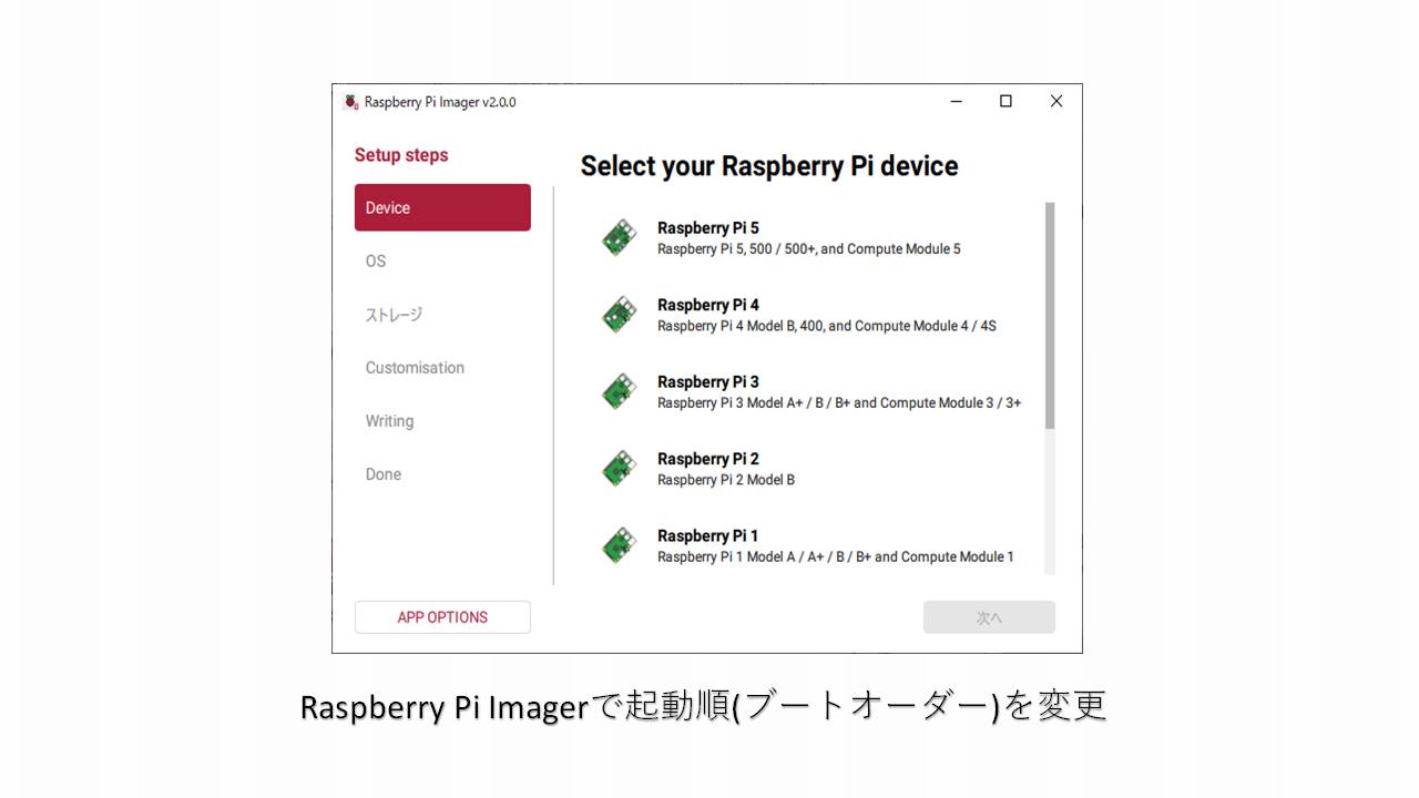 この記事では、Raspberry Pi Imager2.0.0で、ブートオーダーをEEPROMに書き込む専用のmicroSDカード作成して、そのmicroSDカードでRaspberry Piを起動してブートオーダーを設定する手順を説明します。