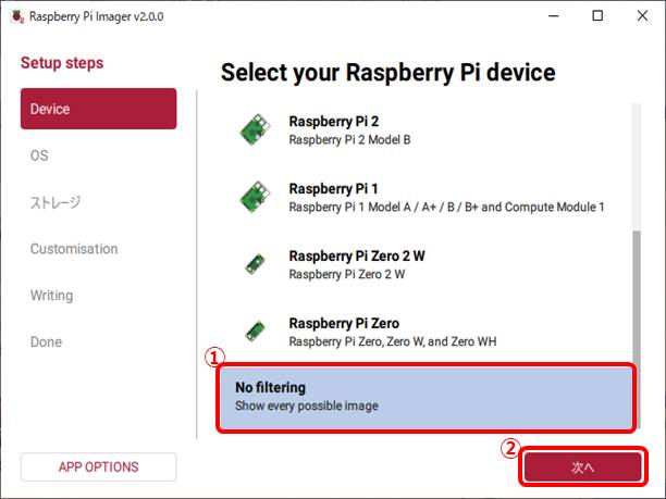 ①でNo filteringを選び②次へ選択