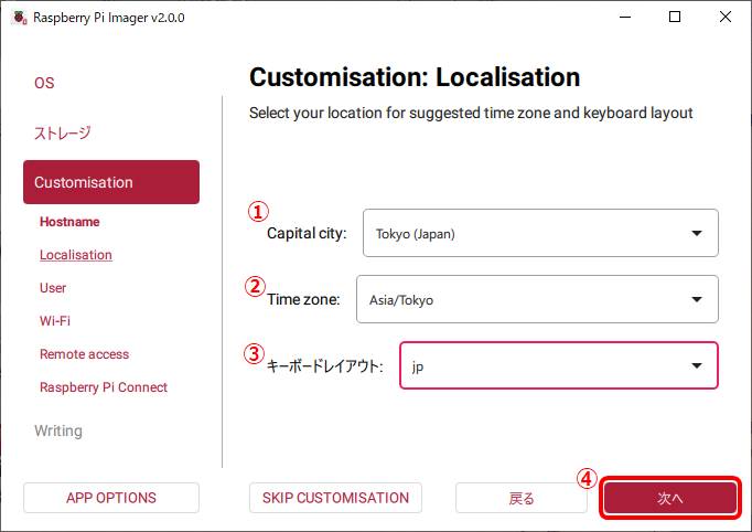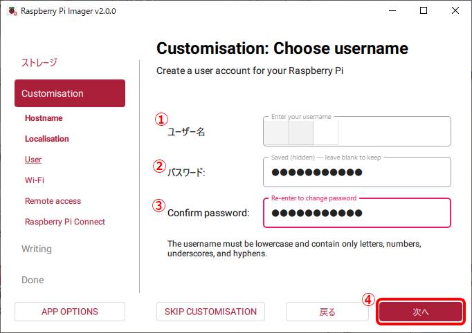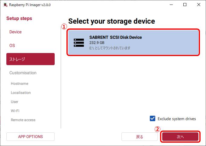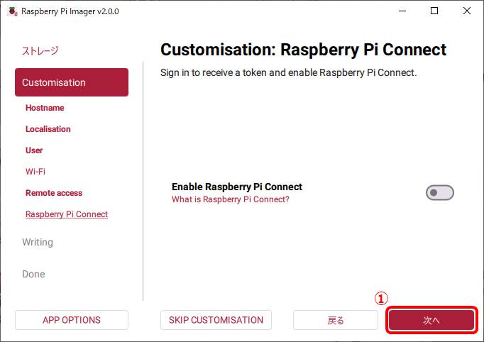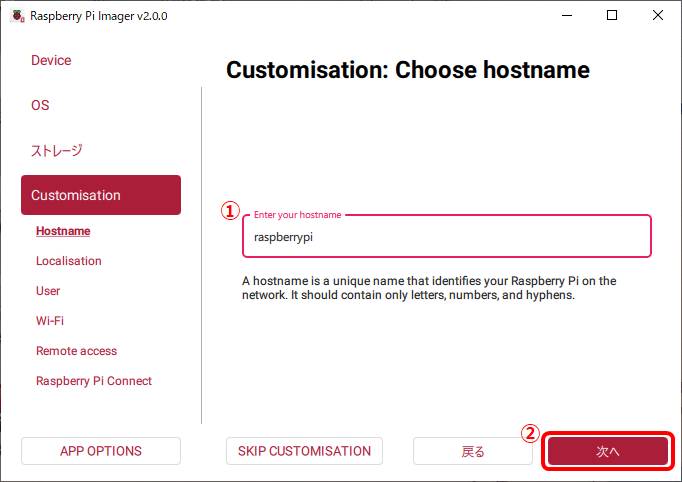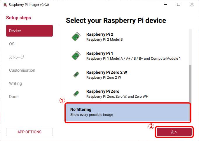 ①Raspberry Pi OS Lite(64-bit)を選択し②次へを選択