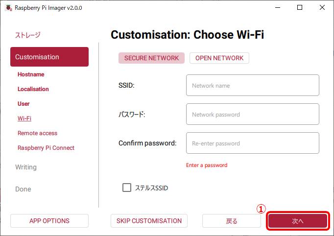 サーバ専用なのでWi-Fiは使用しないのでこのまま①次へ選択