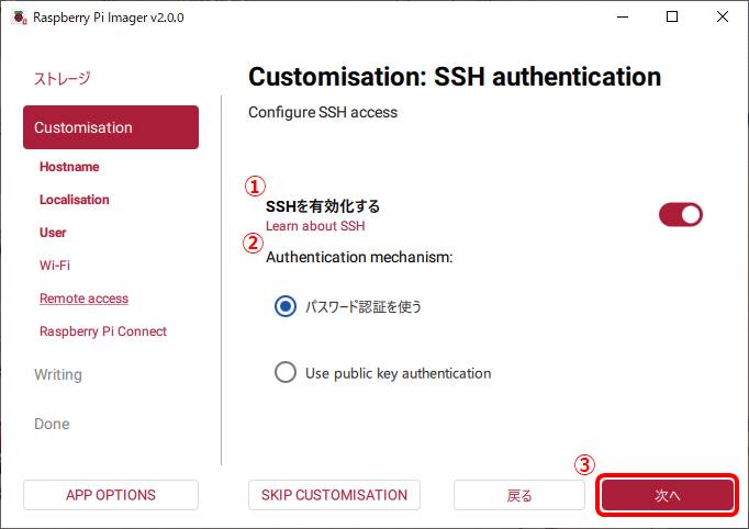 - ② Authentication mechanism: パスワード認証を使うを選択