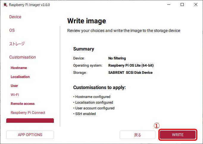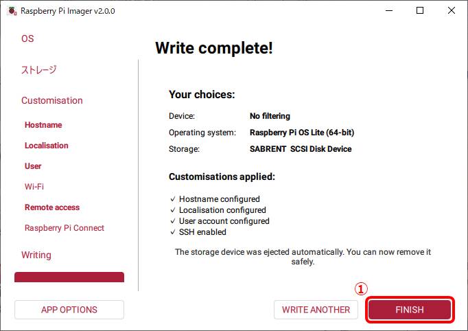 これで起動ディスクに、Raspberry Pi OS Lite(64-bit)が書き込まれました。①FINISHを選択すると本プログラムが終了します。