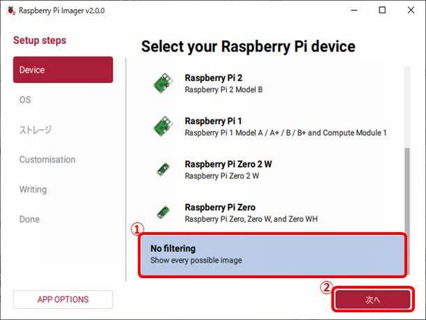 ①No filterlingを選択し②次へを選択