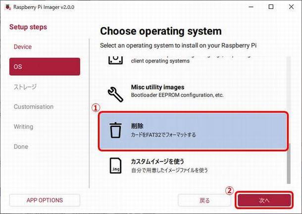 ①削除を選択し②次へを選択